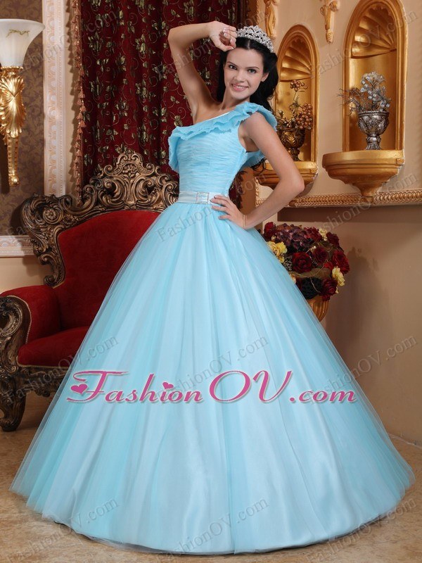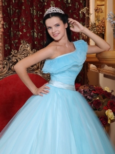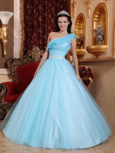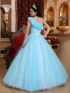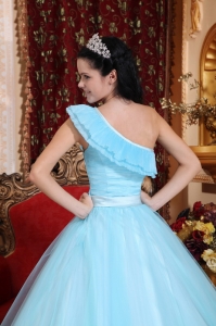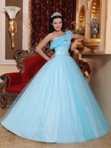 A-line One Shoulder Light Blue Quinceanera Dress Tulle Ruch