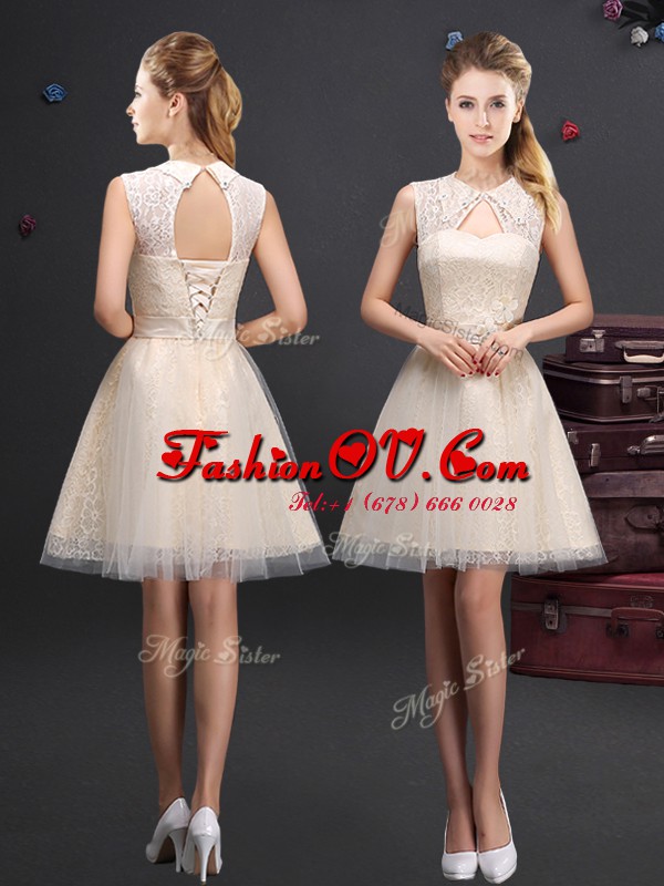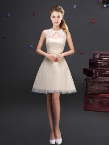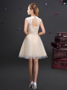 Admirable High-neck Sleeveless Tulle Bridesmaid Dresses Lace and Appliques and Belt Lace Up
