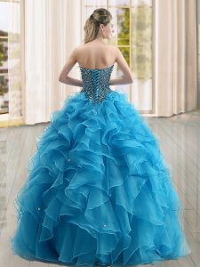 Blue Organza Lace Up Sweetheart Sleeveless Floor Length 15th Birthday Dress Beading and Ruffles