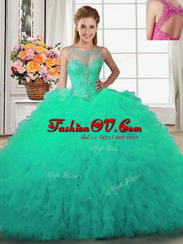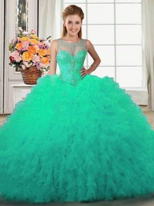Custom Design Scoop Sleeveless Ball Gown Prom Dress Floor Length Beading and Ruffles Turquoise Tulle