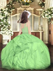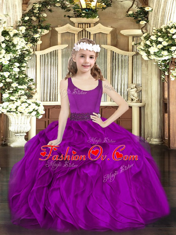 Custom Designed Sleeveless Organza Floor Length Zipper Little Girl Pageant Dress in Fuchsia with Beading and Ruffles