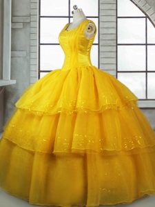 Customized Gold Straps Neckline Ruffled Layers Quinceanera Dresses Sleeveless Lace Up