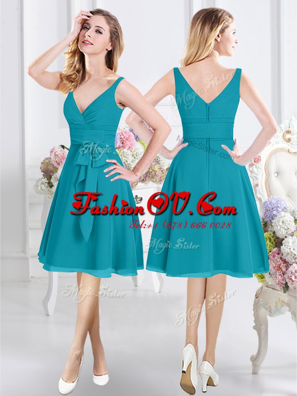 Delicate Sleeveless Chiffon Knee Length Zipper Bridesmaid Dresses in Teal with Ruching and Belt
