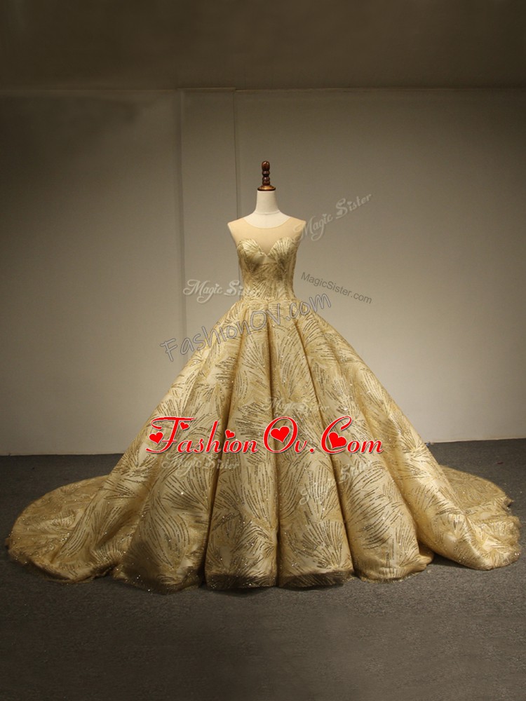 Fantastic Gold Sleeveless Brush Train Sequins Quince Ball Gowns