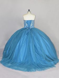 Great Blue Sleeveless Brush Train Beading Sweet 16 Quinceanera Dress