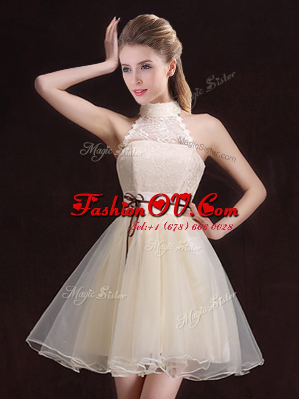 Halter Top Champagne Sleeveless Mini Length Lace and Belt Lace Up Bridesmaids Dress