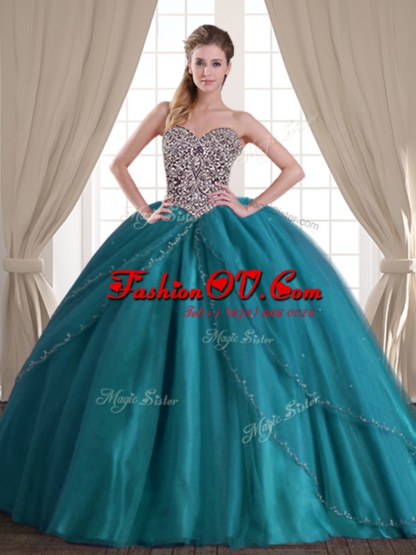 High Quality Sweetheart Sleeveless Brush Train Lace Up 15th Birthday Dress Teal Tulle