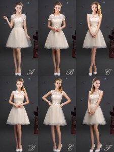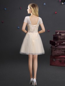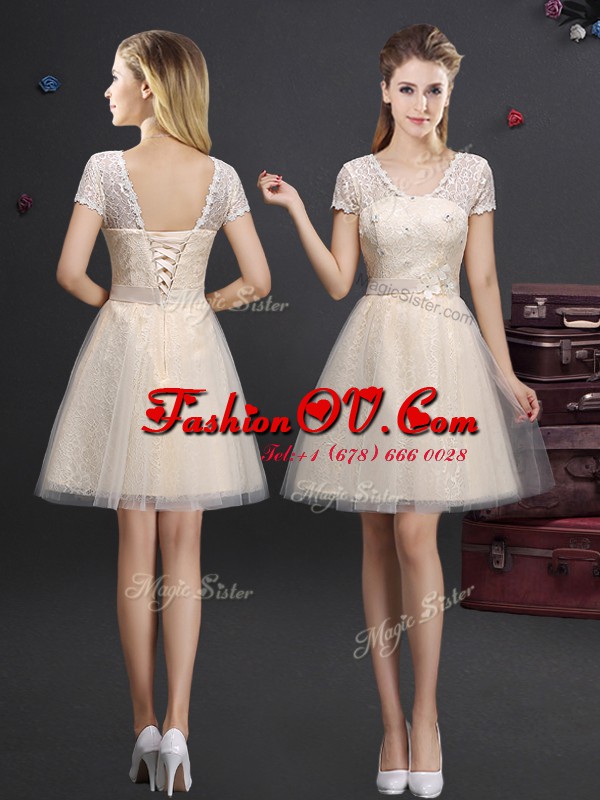 Latest Champagne Tulle Lace Up V-neck Short Sleeves Mini Length Bridesmaid Dress Lace and Appliques and Belt