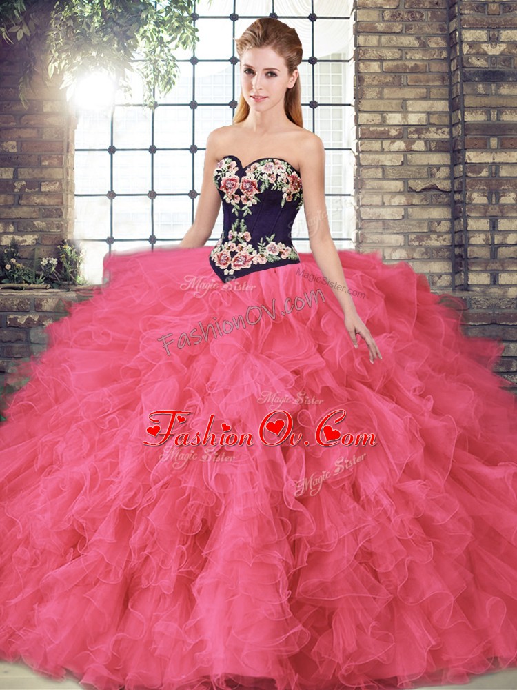 On Sale Hot Pink Tulle Lace Up Sweet 16 Dress Sleeveless Floor Length Beading and Embroidery