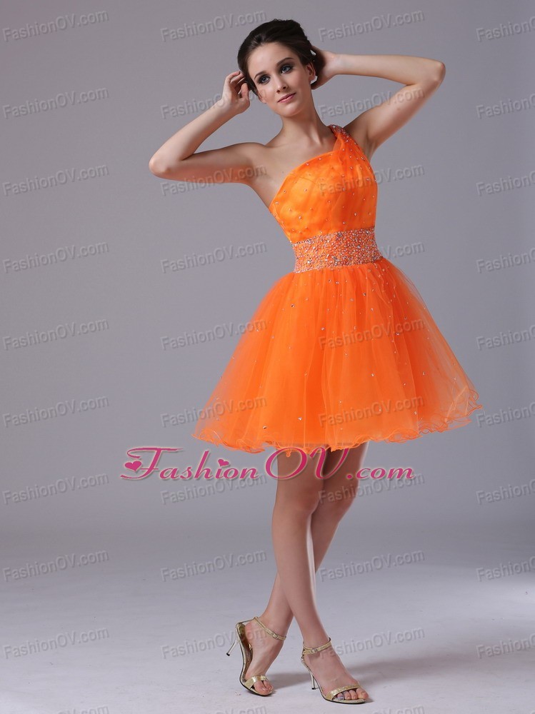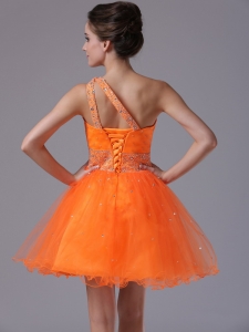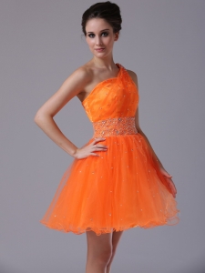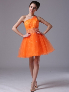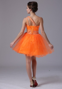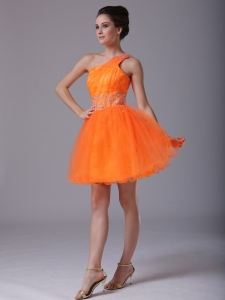 Orange Beaded One Shoulder Mini-length Cocktail Dress