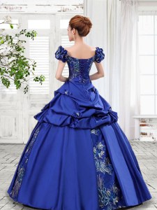 Royal Blue Quinceanera Gown Prom and For with Appliques and Pick Ups and Bowknot Off The Shoulder Cap Sleeves Lace Up