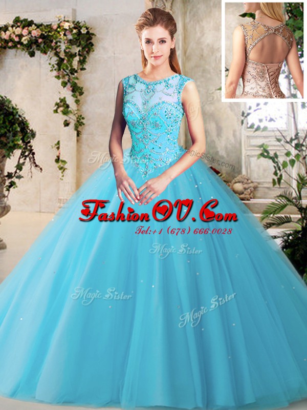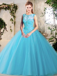 Scoop Floor Length Lace Up 15th Birthday Dress Baby Blue for Military Ball and Sweet 16 and Quinceanera with Beading
