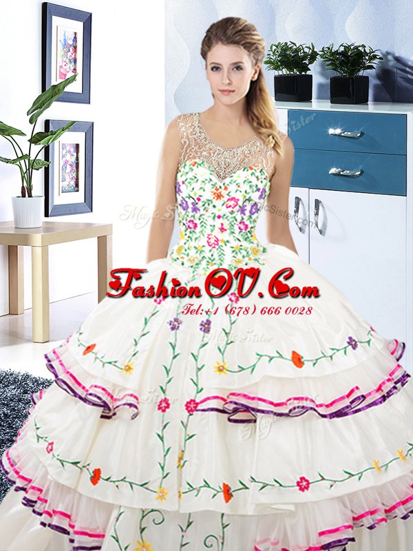 White Lace Up Scoop Beading and Embroidery and Ruffled Layers Sweet 16 Dress Organza and Taffeta Sleeveless